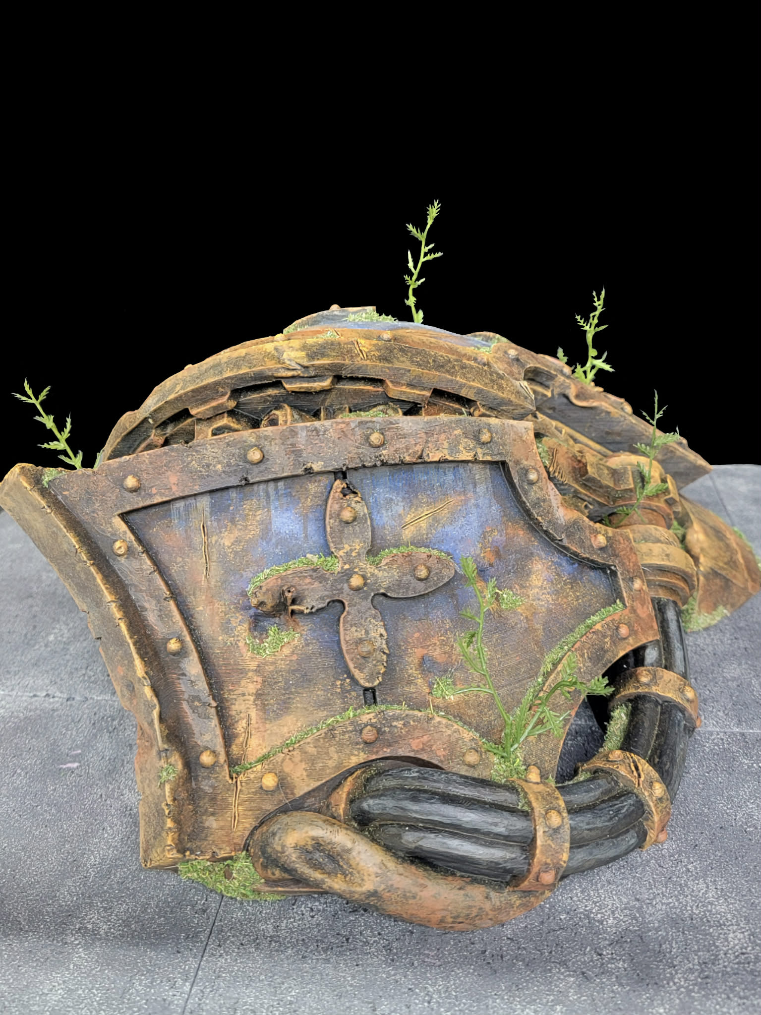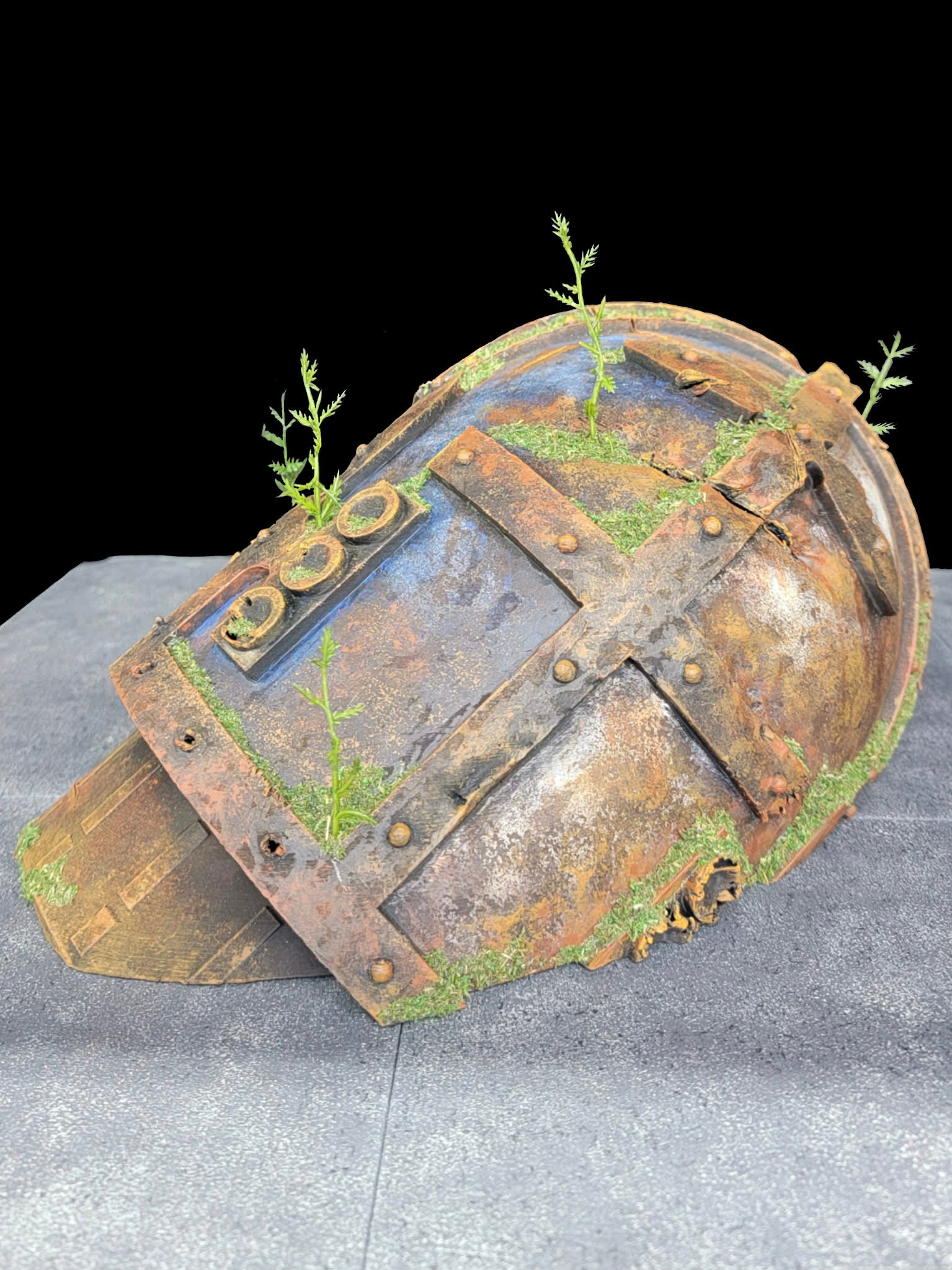 Subtle environmental storytelling is built directly into the piece: creeping moss, invasive plants, and accumulated debris suggest decades, or centuries, of abandonment. Whether displayed as a long-forgotten relic or the aftermath of a recent engagement, the piece immediately grounds any scene in epic scale.