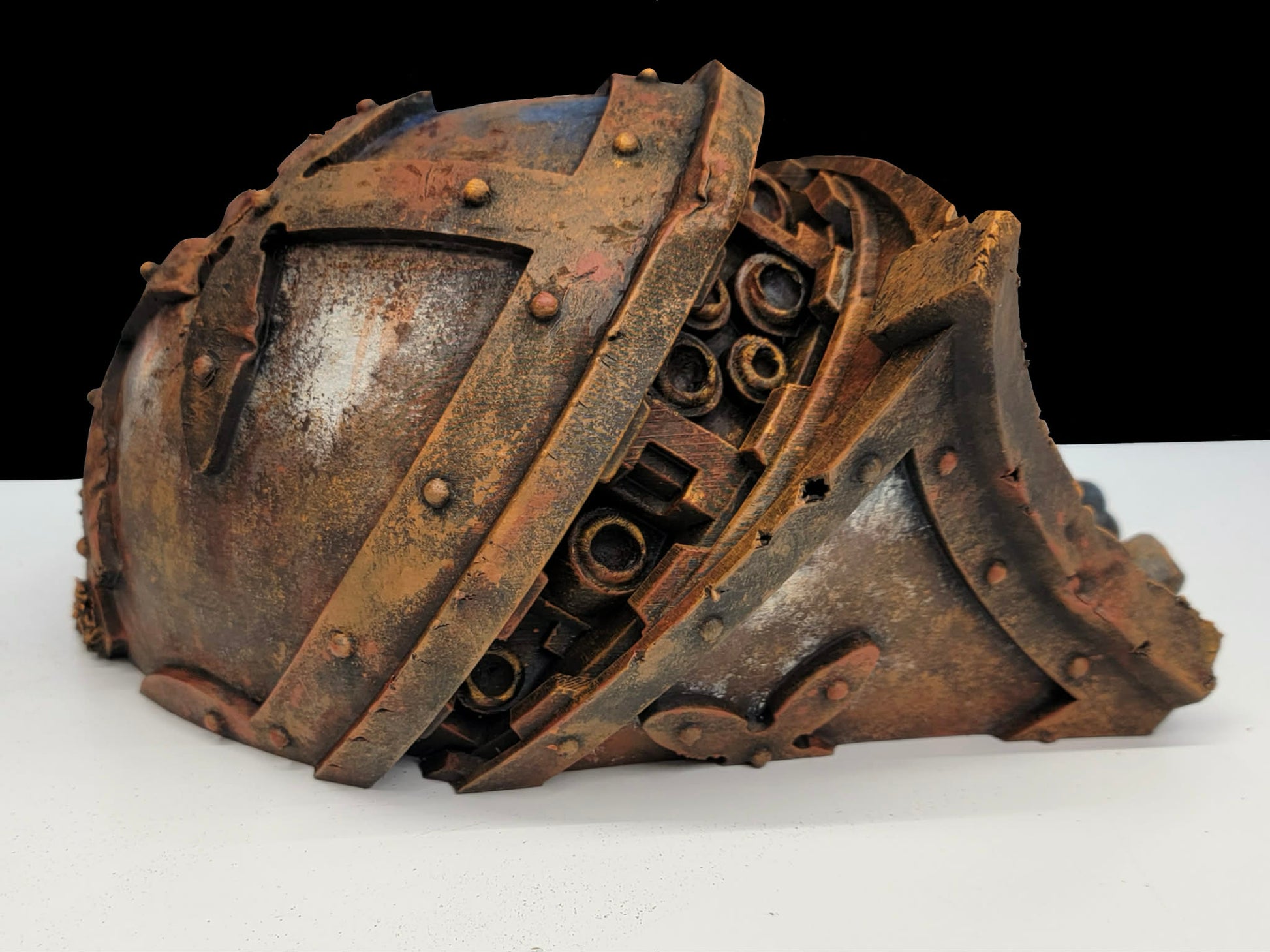 This original sculpted interpretation of a super-heavy titan head draws inspiration from classic ,science-fiction themes, ancient technology, brutal industrial design, and the haunting stillness left after apocalyptic conflict. Massive armor plates are layered with riveted panels, battle scars, and corrosion, while exposed internal components hint at the unimaginable power it once housed.